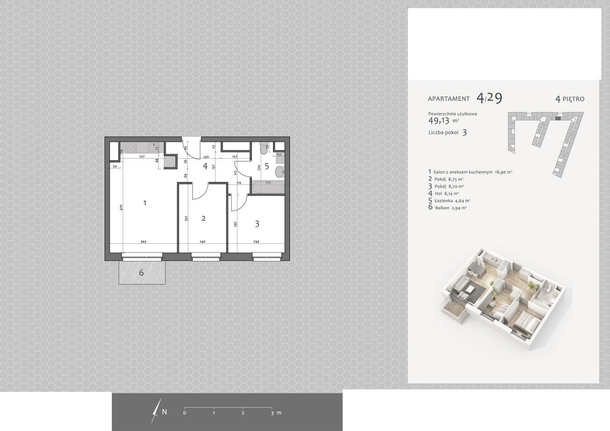 Mieszkanie: 3 pokoje 49.13m²